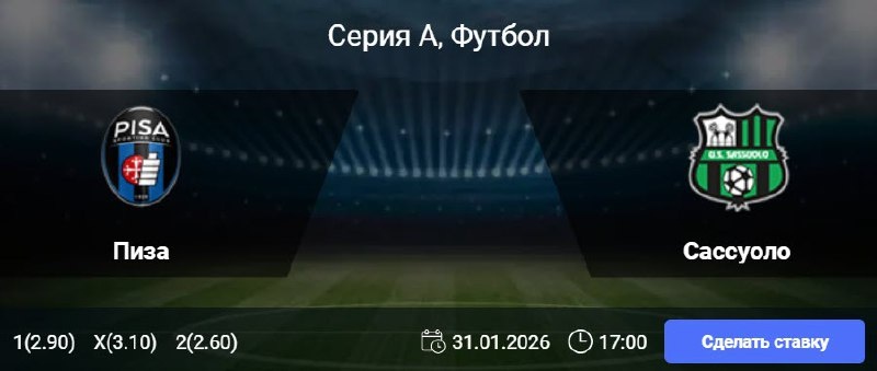 Статистика Пизы: В пяти из семи последних матчей «Пизы» в Серии А обе команды забивали. «Пиза» не одерживала побед в пяти последних домашних играх чемпионата, потерпев четыре поражения и один раз сыграв вничью. В пяти предыдущих домашних встречах команда первой пропускала гол. Статистика Сассуоло: В пяти из семи предыдущих матчей Серии А «Сассуоло» не пропускал более одного гола. Команда не смогла выиграть в шести из восьми последних выездных матчей чемпионата, трижды сыграв вничью и трижды уступив. В шести из семи последних игр «Сассуоло» в турнире было забито не более двух мячей. 🎯 ТМ (2.5) 🎲 кф (1.65) 👉 СДЕЛАТЬ СТАВКУ 🎁 ФРИБЕТ WINLINE - 3000₽ (промокод: BETWIN) 👉 СМОТРЕТЬ ПРОГНОЗ