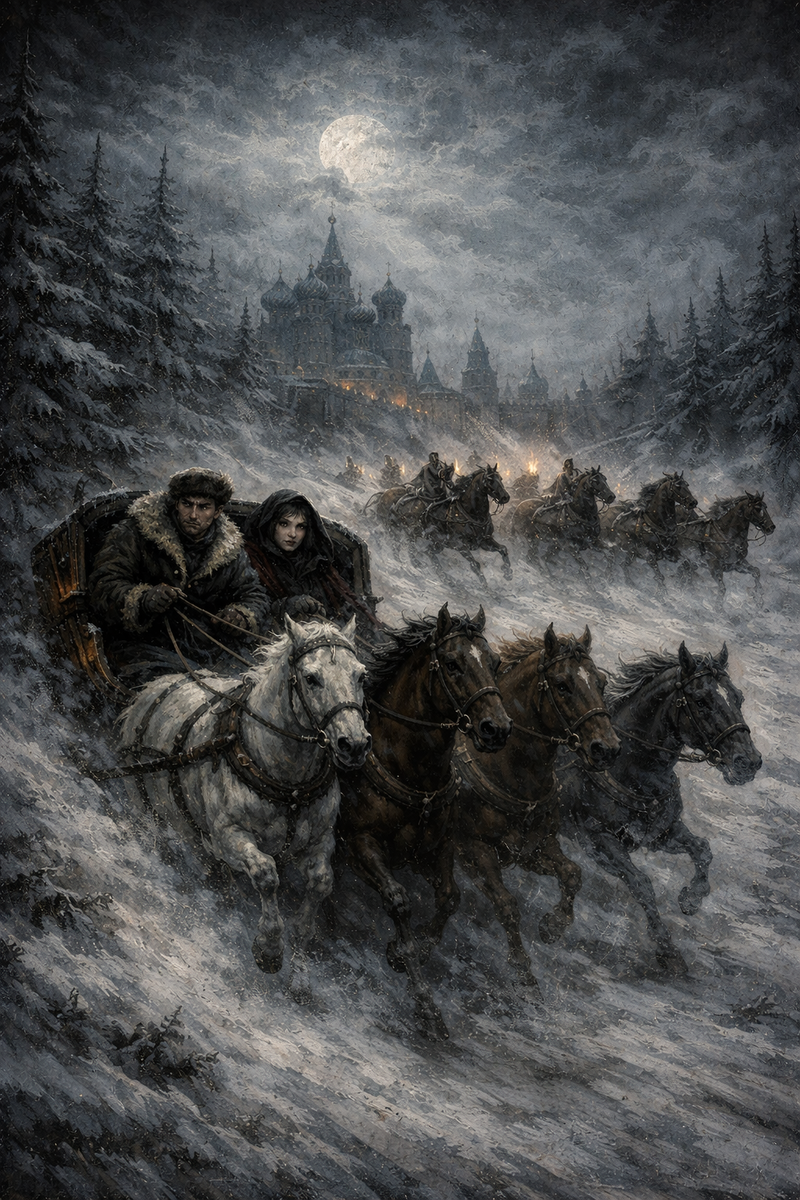 «Дорога превращалась в бесконечный белый коридор, где время замирало, а звуки набата из Москвы 1771 года всё еще звенели в ушах Насти при каждом ударе копыт...»
