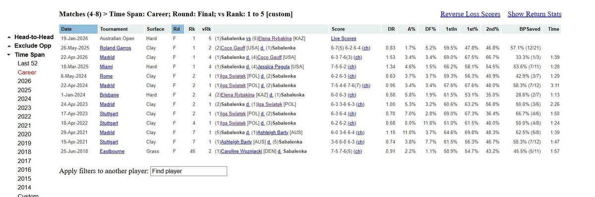 ⚡ Статистика Соболенко против игроков топ-5 в финалах и до них 🎾