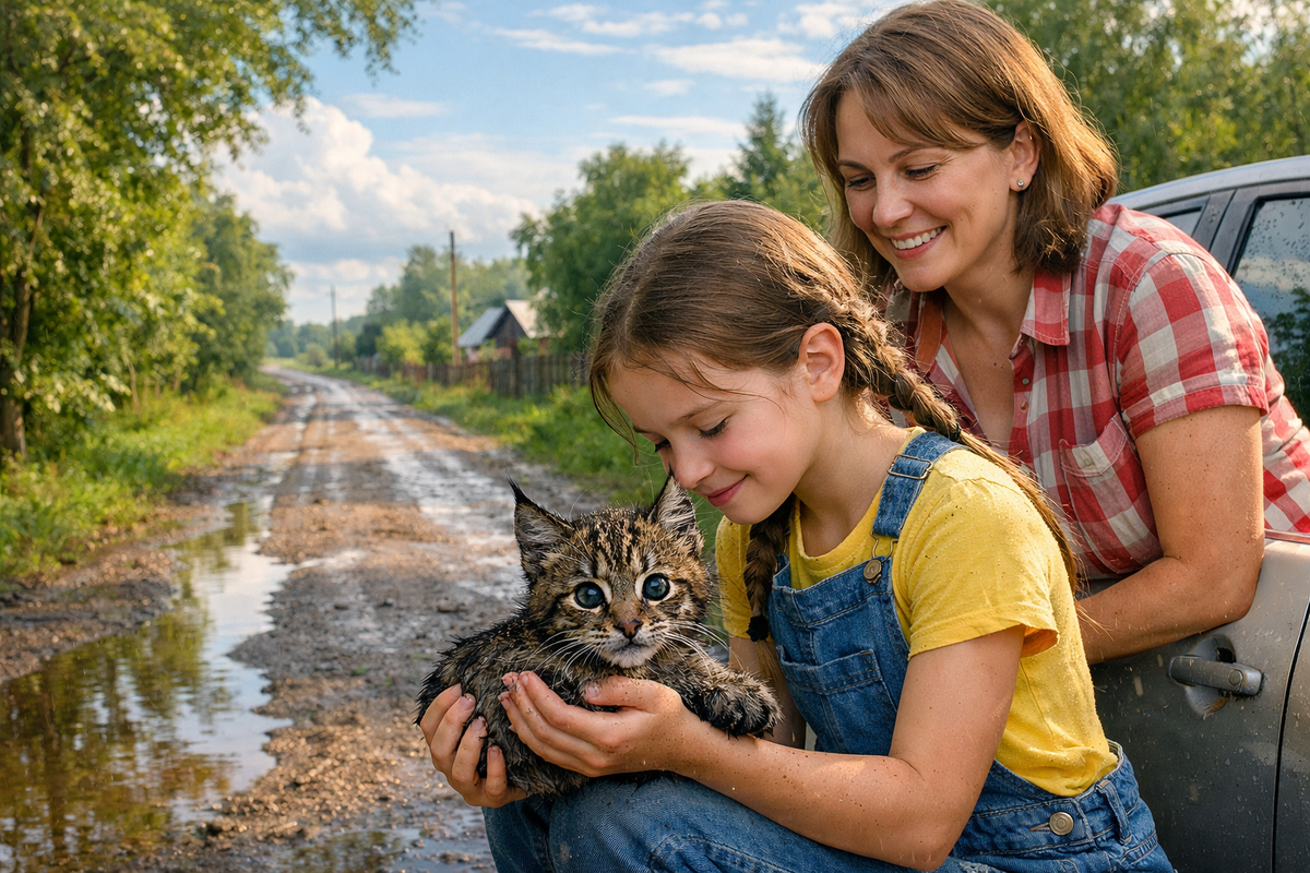 Уже подъезжая к роднику, дочка заметила, что на дороге что-то лежит. Мать подумала, что это камень и решила объехать. Но вдруг, этот камень шевельнулся и приподнял голову. Арина сразу затормозила. Котёнок, мелькнула мысль у женщины, они с Юлей выбежали под проливной дождь, сразу намокли и особо не разглядывая схватили мокрый комочек и забрали в машину.