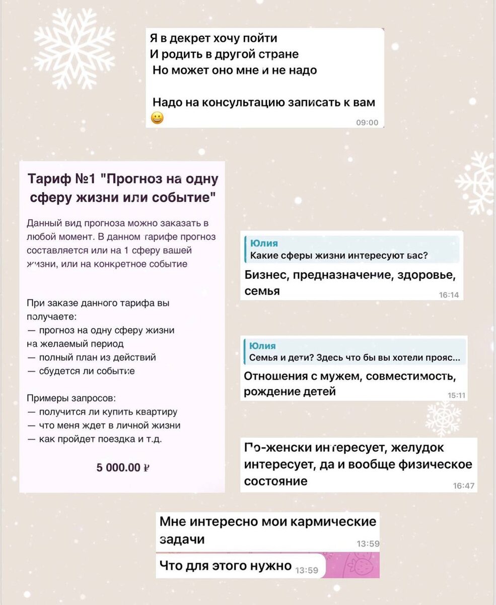 💫 В этом году я добавила услугу «Прогноз на одну сферу жизни или важное событие/события» Эта консультация родилась из ваших вопросов/запросов по разным сферам жизни: 🔺забеременею ли я? Стоит ли планировать беременность в ближайшее время? 🔺что произойдет в сфере карьеры (когда есть планы, а с ними и переживания по смене работы, места работы, профессии, формы занятости и др.) 🔺будет ли премия/повышение или перевод в другой отдел 🔺стоит ли участвовать в соревнованиях, ждет ли меня там успех/награда, что изменит это участие в будущем 🔺благоприятный период для запланированной операции, чекапа, смена образа жизни, питания, начала занятий спортом 🔺в том ли направлении я двигаюсь сейчас в сфере карьеры 🔺 встречу ли я свою любовь в ближайшее время 🔺стоит ли сейчас оформлять законно наши отношения, благоприятные периоды для этого 🔺смогу ли я удачно развестись (психологически выдержу ли, буду ли финансово защищена после развода и др.) 🔺наступил ли кризис в отношениях, сколько он продл