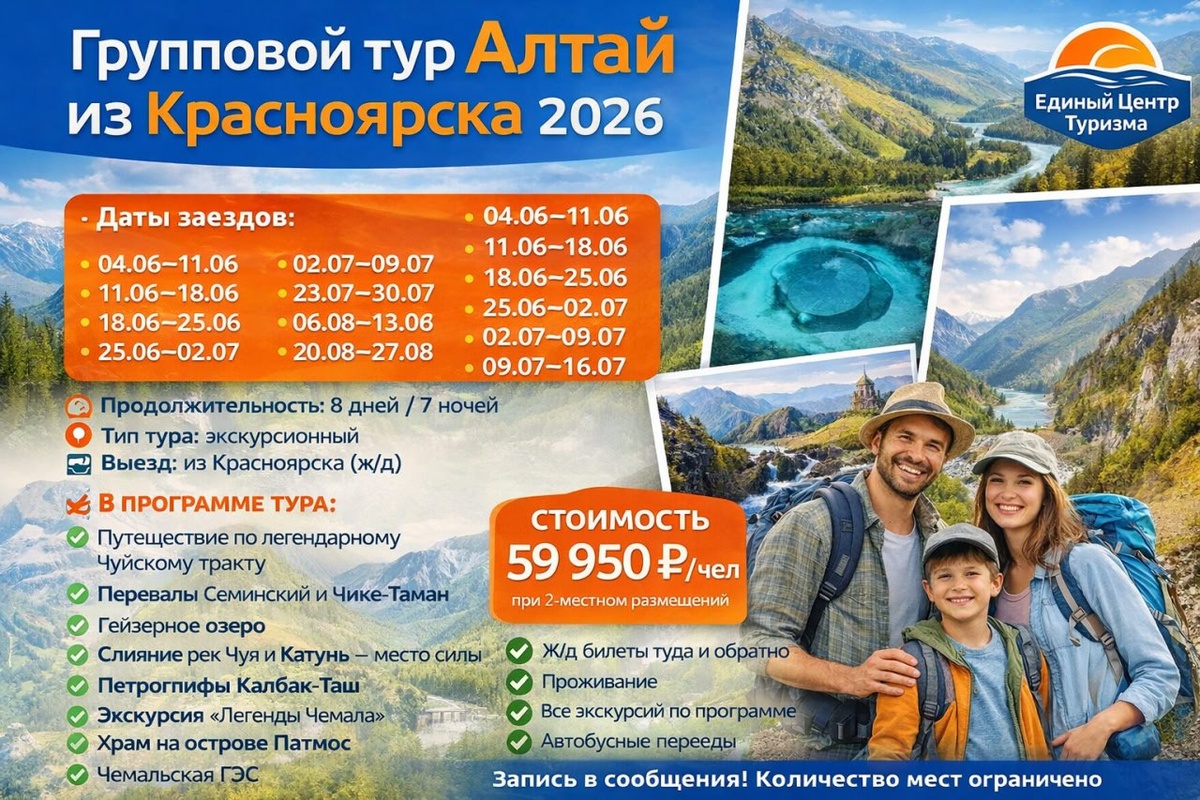 Алтай — это место силы, где горы отражаются в бирюзовых реках, а каждый день наполнен впечатлениями 🌄 Приглашаем вас в экскурсионный групповой тур на Алтай с выездом из Красноярска! 📅 Даты заездов 2026: 04.06–11.06 11.06–18.06 18.06–25.06 25.06–02.07 02.07–09.07 09.07–16.07 16.07–23.07 23.07–30.07 30.07–06.08 06.08–13.08 13.08–20.08 20.08–27.08 ⏳ Продолжительность: 8 дней / 7 ночей 🧭 Тип тура: экскурсионный 🚆 Выезд: из Красноярска (ж/д) ### ✨ В ПРОГРАММЕ ТУРА: ✔️ Путешествие по легендарному Чуйскому тракту ✔️ Перевалы Семинский и Чике-Таман ✔️ Гейзерное озеро ✔️ Слияние рек Чуя и Катунь — место силы ✔️ Петроглифы Калбак-Таш ✔️ Экскурсия «Легенды Чемала» ✔️ Храм на острове Патмос ✔️ Чемальская ГЭС ✔️ Сплав по Катуни с прохождением порога Ирадаш ✔️ Манжерок и гора Малая Синюха (подъемник включён) ✔️ Свободные дни для отдыха и доп. экскурсий ### 🏨 ПРОЖИВАНИЕ И ПИТАНИЕ • Гостиницы по маршруту • Завтраки включены ### 💰 СТОИМОСТЬ 59 950 ₽ / чел при 2-местном размещении ### ✅ В