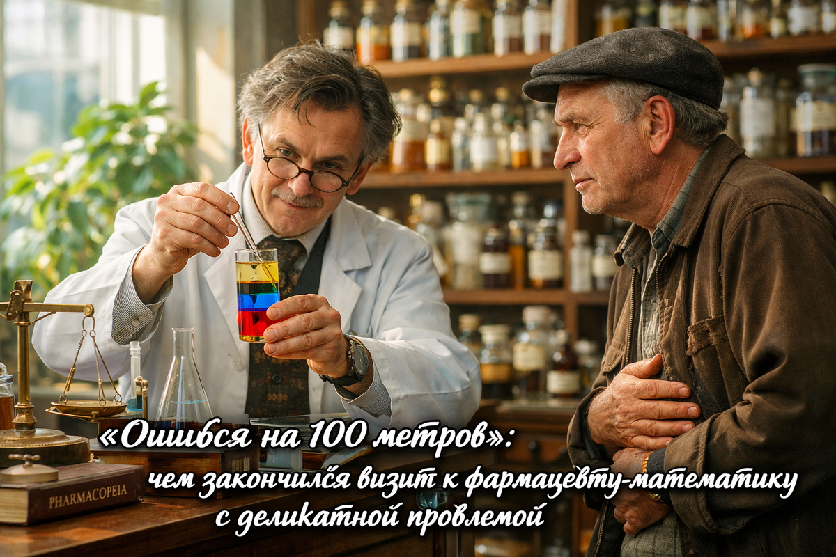 — Очень просто, — с торжеством сказал Иван Семёнович. — Вы спросили расстояние от двери ПОДЪЕЗДА до туалета. А я, к своему стыду, забыл вам сказать… Вчера, буквально на пороге, я встретил соседку, тётю Клавдию, с полной сумкой картошки. Ну, не мог я не помочь донести! Так что от двери подъезда я сначала прошёл пятьдесят метров ДО ЕЁ квартиры на первом этаже, а уж потом — все пятьдесят метров ОБРАТНО и к себе. Итого — сто лишних метров. Ваше же средство, — он почтительно кивнул на склянки за стеклом, — сработало безотказно, прямо у её двери. Пришлось объяснять тёте Клавдии, что у меня внезапно, знаете ли, живот прихватило. Так что спасибо вам ещё и за непредвиденное оправдание. Вы — волшебник.