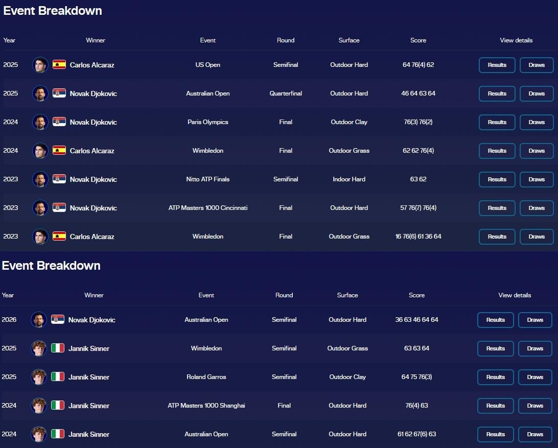 ⚡ Начиная с финала Уимблдона 2023 года, Джокович выигрывал best-of-five матчи только против Алькараса на Australian Open (2-1