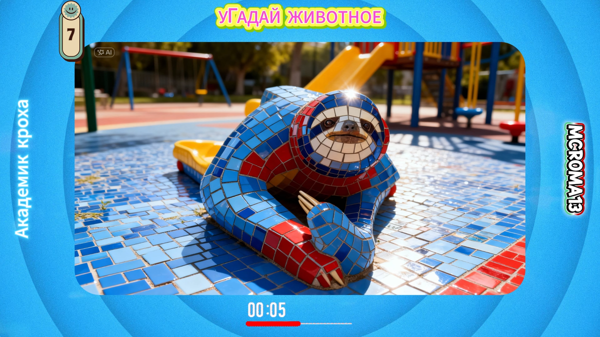 Перед вами яркая композиция, выполненная из мозаики. В центре внимания — фигура, словно сплетённая из разноцветных плиток: преобладают насыщенные оттенки синего и красного. Она лежит на мозаичном полу, повторяющем цветовую гамму. У фигуры вытянуты вперёд «лапы», а её «лицо» с выразительными глазами и расслабленным выражением будто приглашает присмотреться внимательнее. Вокруг — элементы детской площадки: горки, качели, игровые конструкции, но главный акцент всё равно на загадочной фигуре в центре. Что за существо скрывается в этой мозаичной картине? Ссылка на полное видео