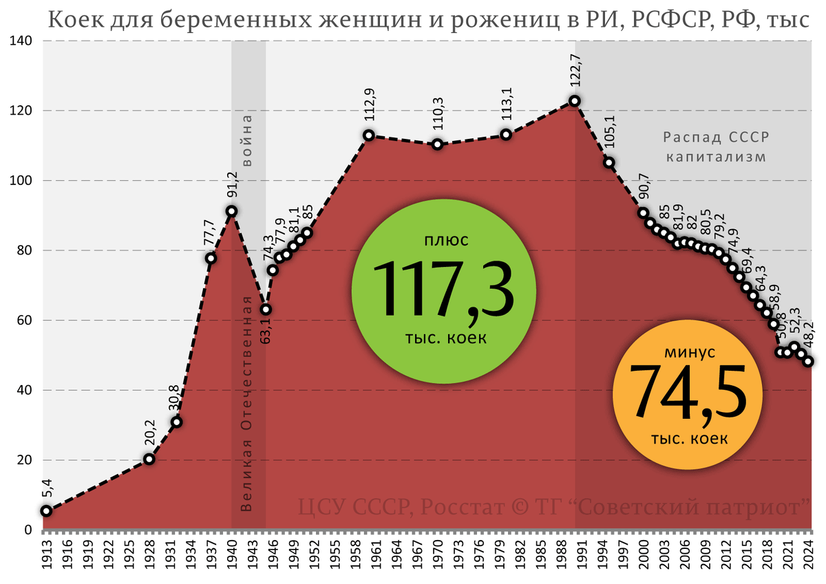 На фоне призывов больше рожать детей (за тарелку супа), федеральные СМИ опубликовали то, на что ваш покорный слуга обращал внимание еще пару недель назад, а именно на стремительное сокращение числа роддомов и больничных коек для беременных и рожениц в России: с 122,7 тысяч в 1990 году до 48,2 в 2024 г. Но что меня поразило более всего, так это попытка оправдать это тем, что в результате "оптимизации" у них, якобы, выросла эффективность использования одного койко-места. Мол, если в "неэффективном" Совке на 10 тысяч женщин приходилось 34 койки для беременных и рожениц, то теперь в 2,4 раза меньше -- 14. Что очень хорошо для экономии бюджета, по их мнению. А то, что теперь будущим мамам ради такой "эффективности" приходится ехать для родов за десятки, а то и сотни километров в ближайший крупный город или региональный центр, а не свой райцентр, как было в СССР, т.н. эффективными менеджерами не учитывается. Всё это говорит о противоположной природе понятия "эффективность" при нынешних т.н.