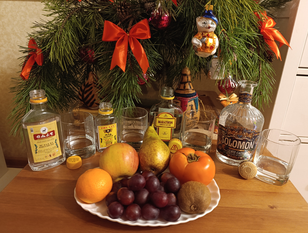 Ну, как-то так… Зато этикетка очень красивая, бутылка тоже ничего! В «Ашане» он продавался с огромным кешбэком, поэтому по совокупности этих факторов я взял его на пробу. К тому же, из своего эфиопского отпуска в октябре 2025 года я специально привёз три разных местных джина, чтобы, не торопясь, распробовать их дома и сравнить с каким-нибудь российским джином. Так и родилась эта статья, посвященная сравнительному тестированию четырёх разных джинов. Начинаю описание в том порядке в котором мы их пробовали на очередном заседании НКВДД (Нижегородского клуба виски- и джино-дегустаторов). Не удивляйтесь, что на фото наши бокалы размером с бутылки: привозный джин - в разной мелкой таре, Baro’s Dry Gin - 250 мл, Marathon London Dry Gin -200 мл, Mapple Dry Gin - 110 мл.