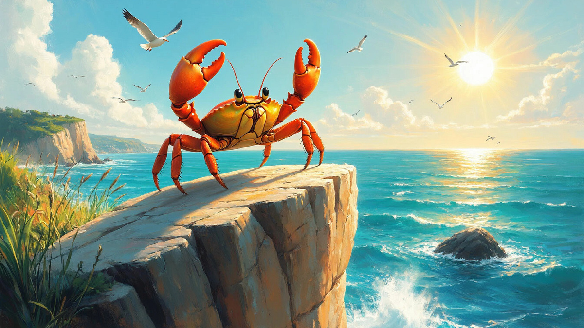 На берегу Тихого Океана, там, где волны вышивают кружево из пены, жил маленький крабик по имени Крош. У него был одна смешная клешня больше другой, и он двигался не прямо, а чуть боком, будто всё время заглядывал за угол.