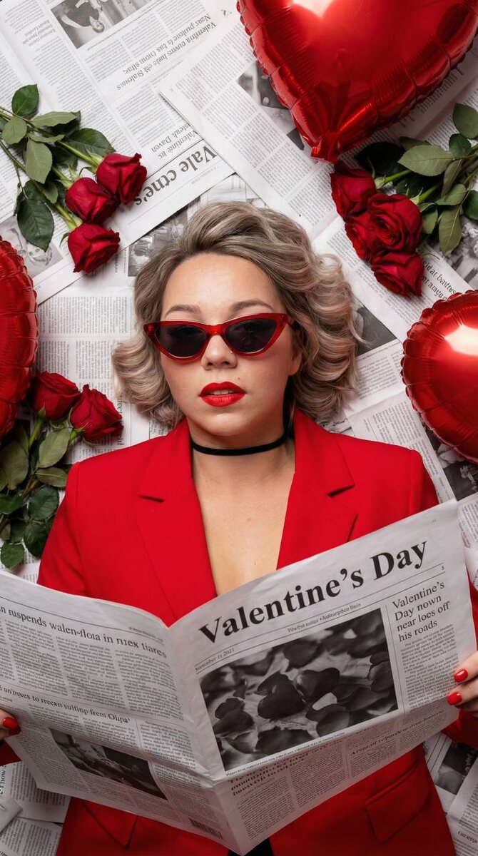 🌟Переходим на удобный сервис для генерации: Ссылка 👉 Syntx Ai Ссылка 👉 Veo3 📌ИНСТРУКЦИЯ ПО ИСПОЛЬЗОВАНИЮ В ЗАКРЕПЛЕННЫХ СООБЩЕНИЯХ ◾️ПРОМТ : Гиперреалистичное, детализированное фото в вертикальном формате: гламурная девушка лежит среди разбросанных газет, красных роз и красных воздушных шаров в форме сердца. На ней яркий красный блейзер, черное чокер-ожерелье и красные солнцезащитные очки-кошачий глаз. Волосы короткие, но густые, с объемом у Корней, красиво уложены в голливудские локоны. Губы накрашенные ярко-красной помадой. Девушка держит в руках газету с крупной надписью "Valentine's Day". Студийное освещение, высокая контрастность, модная эстетика, RAW фотография, 8k, реализм, вид сверху.