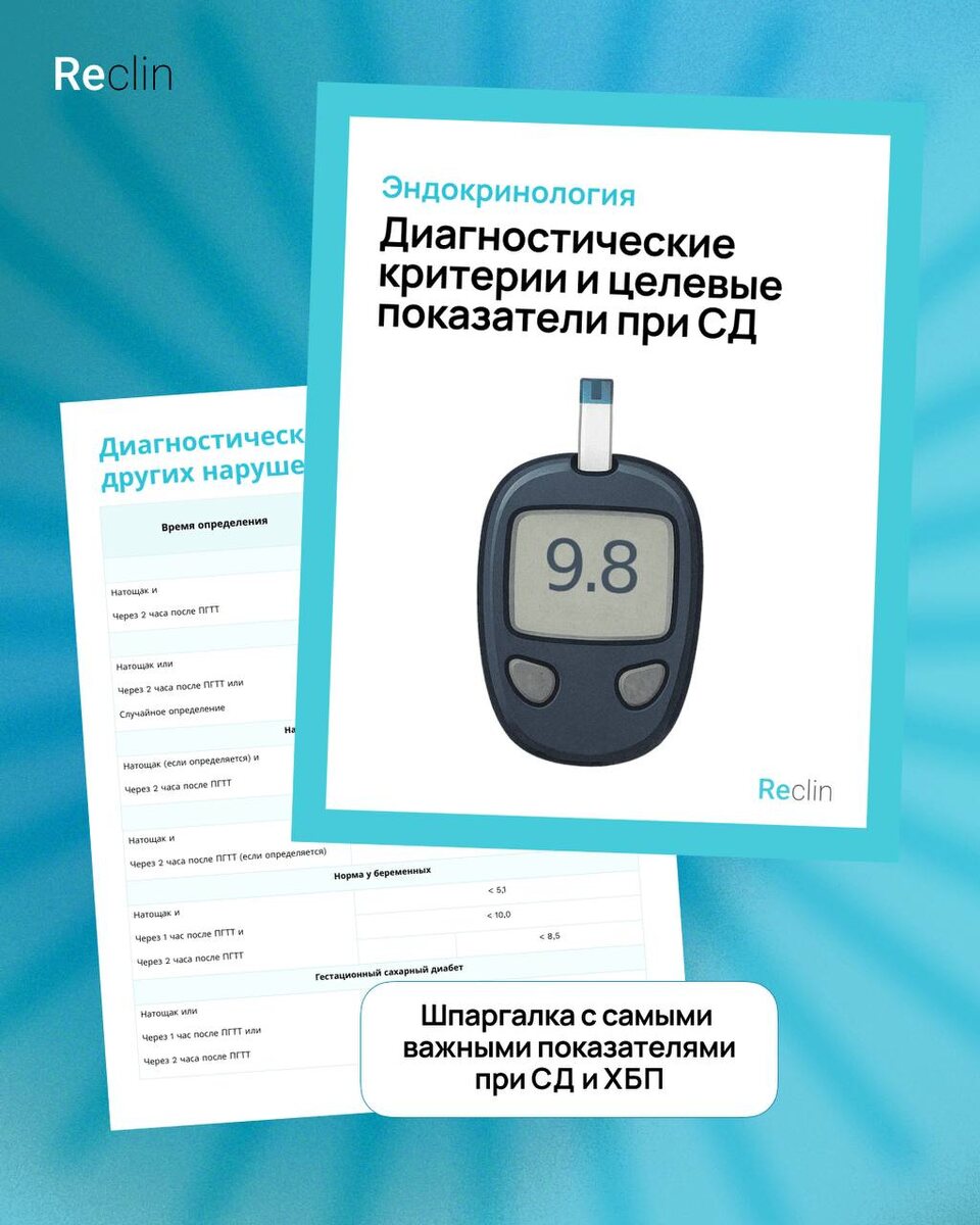 🧪 Диагностические критерии и целевые показатели терапии Определить целевой HbA1c для конкретного пациента или быстро вспомнить стадию ХБП по СКФ… Задачи вроде привычные, но в моменте легко засомневаться. 🔢 В гайде-шпаргалке собрали самые важные «цифры» по СД и ХБП: - критерии диагностики — в одной таблице - подбор индивидуальных целей терапии - целевые значения основных параметров: от АД до показателей НМГ ⚡ Чтобы получить гайд: 🤩 Подпишитесь на наш канал 🤩 Поставьте реакцию 🤩 Перейдите в нашего бота 🤩 забрать гайд 🤩