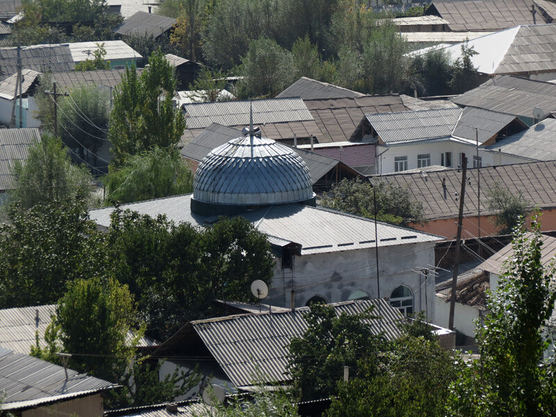 Узген - древнейший город Киргизии, населённый в основном узбеками. Древности находятся в его верхней, в основном советской части, а вот Нижний Узген - это царство старых махаллей. Хотя статус города Узген вернул себе лишь в 1927 году (через 700 с лишним лет после нашествия Чингисхана), фактически он стал таковым как минимум в 19 веке. Махалли раскинулись на километры, и сверху видно как минимум три мечети: Сложное русло Карадарьи с множеством проток, крыши махаллей, навес для прогуливающихся (городище тут вместо парка) и тот самый служебный домик, куда мы, спустившись с минарета, и вернули ключ. А спускаться решили прямо по склону, усеянному небольшими могилками. Под обрывом проходит арык, вдоль него - частокол тополей. Мы уткнулись в забор, начали его перелезать по прилегающему обрывчику, чем привлекли внимание стоящих рядом узбеков, и когда слезли - аккуратно одетый пожилой человек заулыбался, расспросил, кто мы и откуда, и предложил пройти с ним. Обитатель махаллей. Водил нас не он.