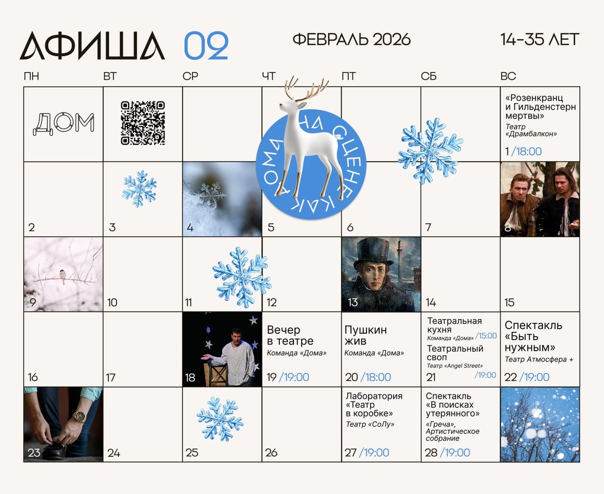 💕 🌟 1 февраля | 18:00 «Розенкранц и Гильденстерн мертвы» от театра «Драмбалкон» Приглашаем обсудить легендарную пьесу Тома Стоппарда, перевернувшую сюжет шекспировского «Гамлета». Разберем философские смыслы этой абсурдистской трагикомедии и сравним знаковые мировые постановки с актуальной петербургской сценой. 🎟 Регистрация здесь! 🌟19 февраля | 19:00 Вечер в театре от команды «Дома» Смотрим и обсуждаем видеозапись моноспектакля Евгения Гришковца «Одновременно» — постановку, в которой повседневность жизни обычного человека превращается в настоящую философию. 🎟 Регистрация здесь! 🌟 20 февраля | 18:00 «Пушкин жив» от команды «Дома» Приглашаем на поэтический вечер, приуроченный ко дню памяти Александра Сергеевича Пушкина, где в теплой домашней обстановке мы вспомним наследие великого поэта. Формат открытого микрофона позволит каждому поделиться любимыми строками и найти творческое единение в неспешном живом общении. 🎟 Регистрация здесь! 🌟 21 февраля | 15:00 Театральная кухня о