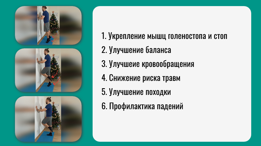 - Укрепление мышц голени и стопы: Упражнение помогает укрепить икроножные и камбаловидные мышцы, что улучшает силу и стабильность голеностопа.