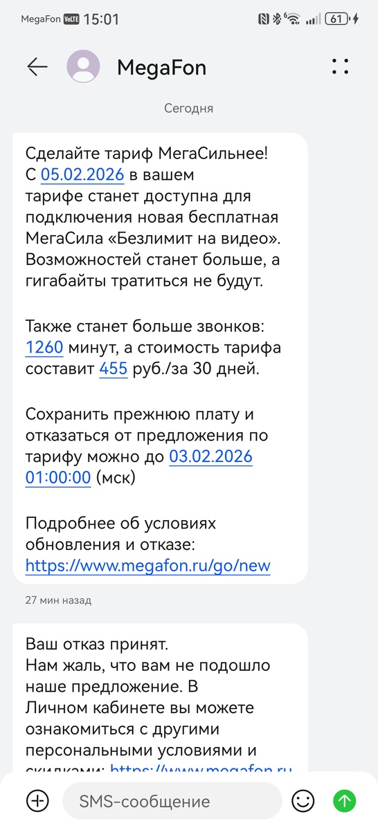 Вскользь прослушала сообщение от дочери, которой Мегафон попытался поднять оплату порядка +/- 100 рублей в месяц. И, якобы, можно отказаться от нового тарифа, перейдя по ссылке.
