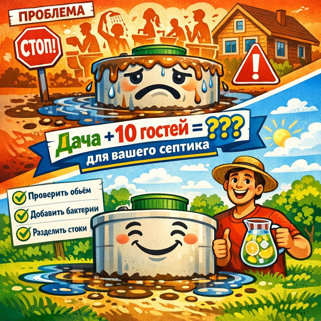 Лето, дача, друзья. Идеально? Почти. Ваш септик, рассчитанный на семью из 4-5 человек, в один уик-энд может получить ударную дозу стоков от 10-15 гостей. Результат — переполнение, неприятный запах и лужи на участке. Чтобы этого не случилось, нужна не диета для гостей, а умная подготовка системы. Вот ваш план накануне заезда.