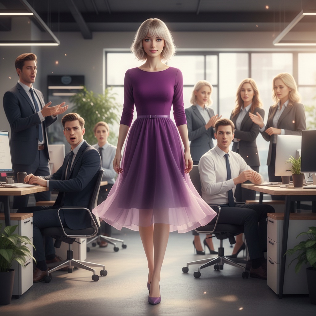 В понедельник Жанна пришла обновлённой. Классическое фиолетовое платье, лёгкая юбка которого плавно струилась, идеально подчёркивало её стройную фигуру. Тонкий ремешок, нежно охвативший талию, выделял её утончённые формы, а новая стрижка с чёлкой добавляла её лицу очаровательную миловидность. Стилист поработал на славу и открыл миру Жанну!