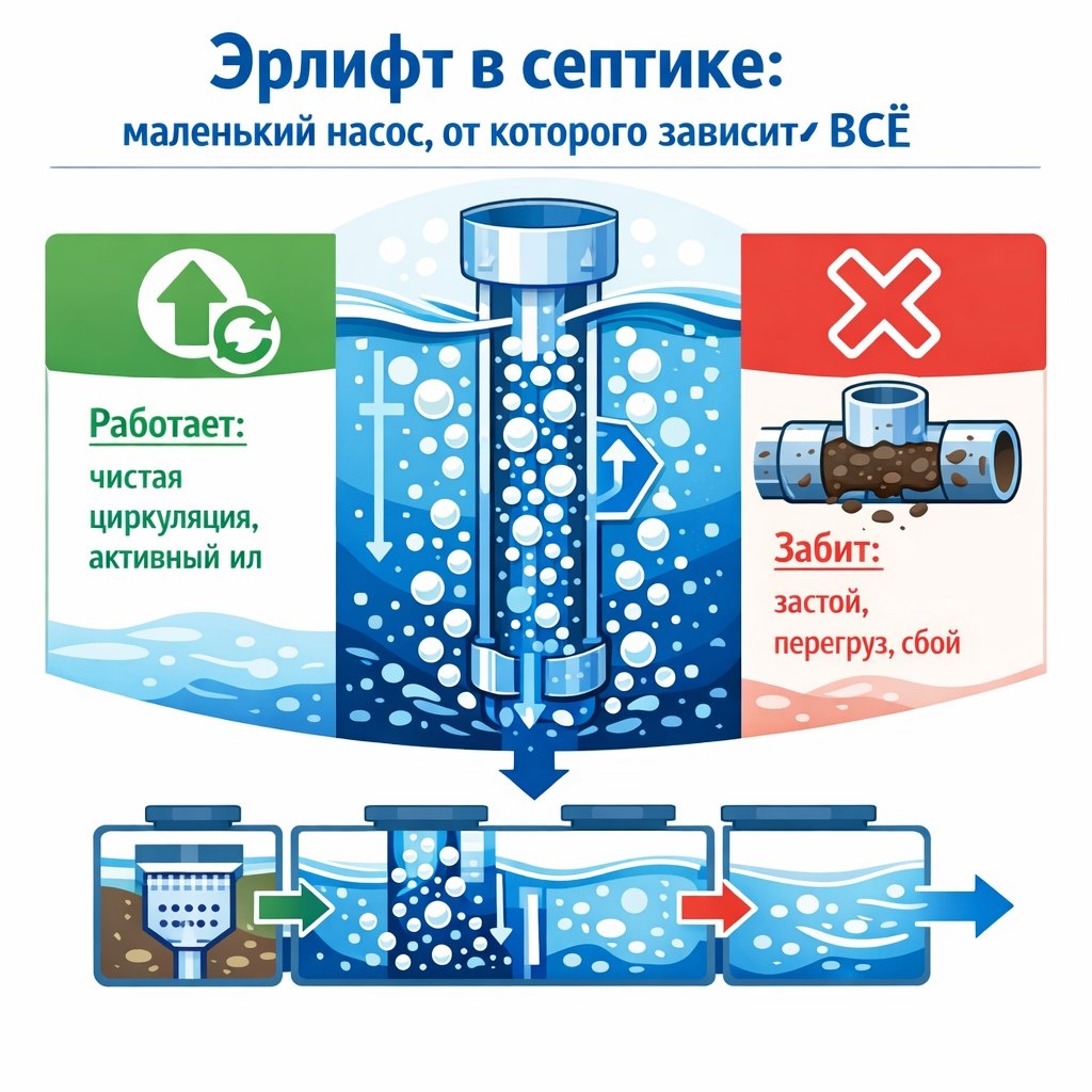 Вы знаете про компрессор и аэратор. Но сердце циркуляции в станции биоочистки — это эрлифт