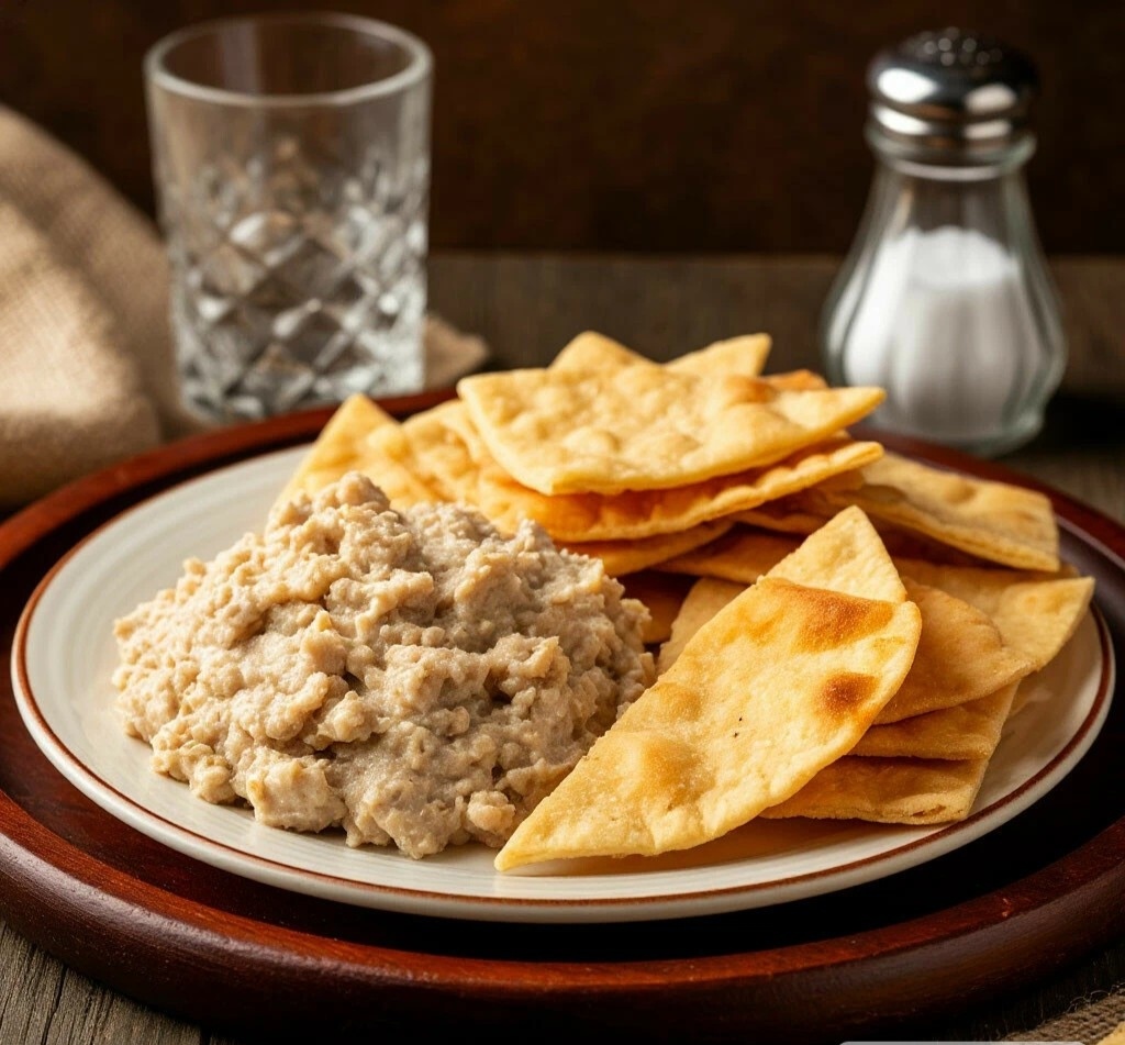 5. 🍘 Подаём с хрустом! Охлаждённый форшмак выкладывай чайной ложечкой на хрустящие чипсы из лаваша и сразу подавай к столу! Сочетание нежной пасты и хруста — это нечто! 😻✨