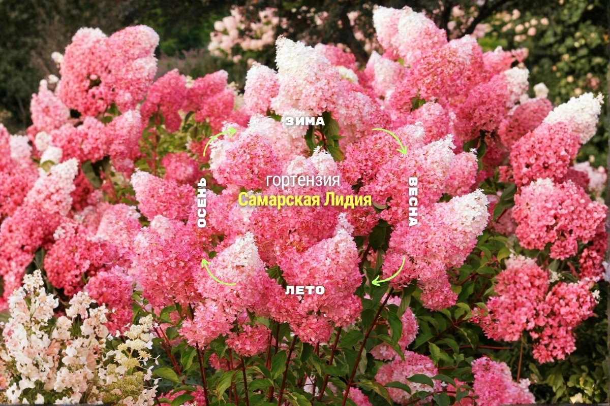 Насыщенно-зелёные матовые листья с характерной лёгкой шероховатостью создают спокойный фон для цветения. Осенью ожидайте появление бордово-красных оттенков. Их интенсивность варьируется в зависимости от освещения и погодных условий. Цветение — главное впечатление от сорта Изменение окраски происходит постепенно: Благодаря этой плавной трансформации куст долго остаётся выразительным и не «теряется» в саду даже в конце сезона, когда многие культуры уже снижают декоративность. Зимостойкость: до −34 °C Гортензия Samarskaya Lydia одинаково ум