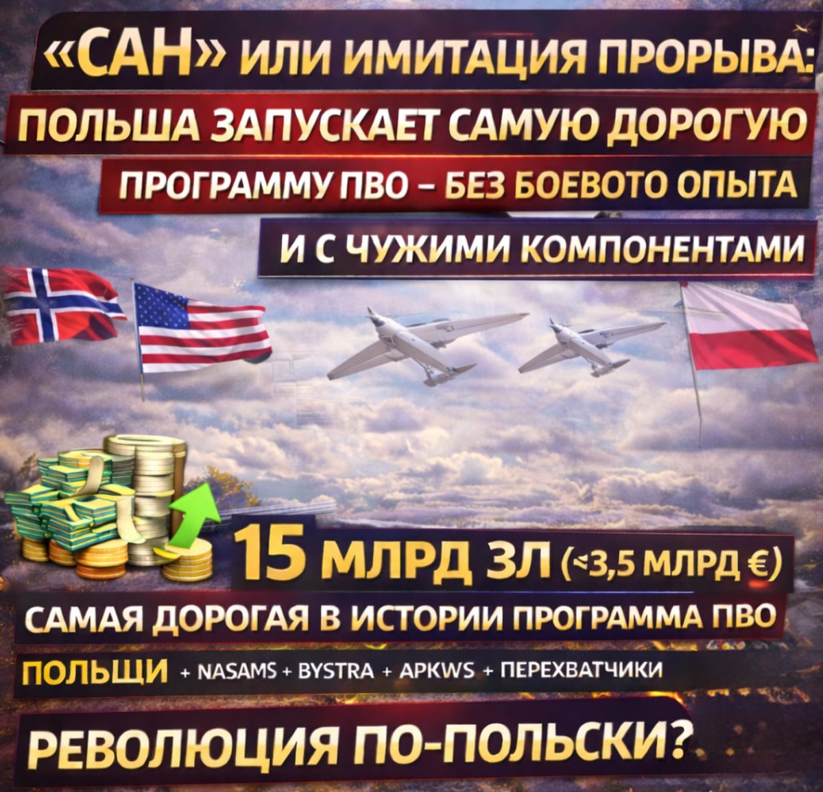разработка ВПК Польши, способная обеспечить защиту от БПЛА, барражирующих боеприпасов и маловысотных целей. В рамках национальной стратегии мобильных систем ПВО (PBD-M, Przeciwlotniczy Bezpośredniego Działania – Mobilny), утверждённой в 2023 году, МО Польши подписало многомиллиардные контракты на поставку 18 батарей, интегрирующих компоненты польского, американского и норвежского происхождения. Объём финансирования до 2027 года составит около 3,5 млрд евро, включая средства из европейского оборонного фонда SAFE, что делает «САН» крупнейшей программой ПВО в истории Польши. В состав батареи входят 35-мм и 30-мм автоматические пушки (производства польской HSW и немецкой Rheinmetall), ПУ с ракетой APKWS (стоимость одной ракеты ~ 22-25 тыс. долл.) от BAE Systems, дроны-перехватчики и элементы РЭБ (подавление в 2,4 ГГц и 5 ГГц, до 5 км). Обнаружение целей — опять же за счет экспериментальных активных трех координатных РЛС FIELDctrl X-диапазона от компании APS. Также сообщается и о наличии си