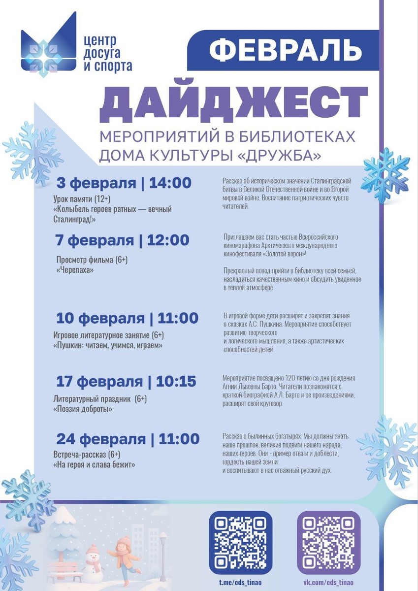 ! ❄ Дорогие читатели! Пока зима ещё радует нас своими пейзажами, в наших библиотеках становится всё теплее от ваших улыбок и интересных событий. ✨📖 Приходите за новыми знаниями, вдохновением и просто хорошим настроением. В библиотеке каждый найдёт занятие по душе! 🕊🌟 ❓ Почему стоит прийти? — Узнать много нового и расширить свой кругозор; — Провести время в уютной атмосфере библиотеки; — Познакомиться с интересными людьми и найти новых друзей. 🙌 📍 Следите за расписанием на наших официальных страницах в ВК https://vk.com/dkdruzhba_voronovo ТГ https://dzen.ru/id/625d325bddf28c3e2d380e23 и на информационных стендах, чтобы не пропустить наши познавательные программы и развлекательные встречи! 📅✨ #анонсывороново #анонсытинао #новоститинао