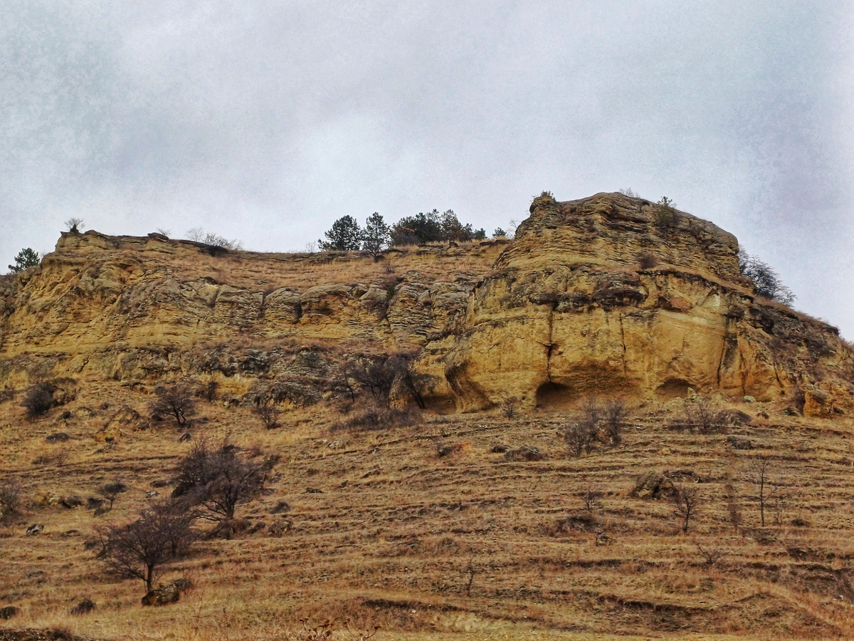 пещере. Я отдышалась и поднялась к ним. Дальше сложно. Костя боялся. Вниз было страшно смотреть. Приняла решение подняться до конца. По скользкой траве идти нужно осторожно, порода песчанника то и дело обваливалась. Мы влезли на утёс и выдохнули. Туристы уже были далеко.