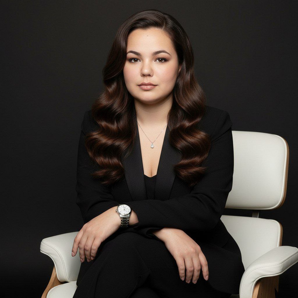 😀Выбираем "нейросети" 😀Нажимаем "Nano Banana" 😀Нажимаем "Nano Banana Pro" 😀Прикрепляем через скрепку свое фото и выбранный промпт 😀Наслаждаемся результатом😍 Создай фото не меняя черты лица и цвет волос. "Элегантный портрет женщины в современной белой кресле, в чёрном классическом костюме с атласными лацканами, уверенная поза со скрещенными ногами. Длинные каштановые волосы, густые глянцевые голливудские волны, глубокий боковой пробор и лёгкий объём у корней. Макияж в стиле soft‑glam: идеальная кожа, мягкий контуринг и тёплый бронзер, нежная стойкая подсветка на скулах, нейтрально‑коричневый дымчатый макияж глаз с тонкой подчёркивающей стрелкой и пушистыми ресницами, аккуратно уложенные тёмные брови, бархатистые нюдово‑розовые губы. Минималистичные аксессуары: тонкая серебристая цепочка с каплевидным подвесом с небольшим камнем, крупные классические часы с металлическим браслетом на запястье; чистые нюдовые ногти. Чёрный фон, мягкое студийное освещение, акцент на текстурах волос