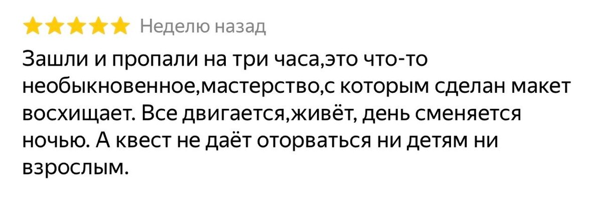Спасибо, что делитесь впечатлениями, возвращаетесь и рекомендуете нас друзьям. Мы собрали несколько слов, которые особенно приятно было читать в этом месяце 🤍 Читаем, улыбаемся и идём дальше делать наш шоу-макет «Золотое кольцо» ещё лучше.