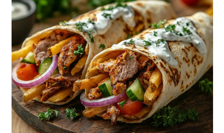 В Греции гирос чаще всего готовят со свининой и кладут в начинку картофель фри. Вместо соуса дзадзики иногда добавляют горчицу или кетчуп и заворачивают начинку в лаваш.