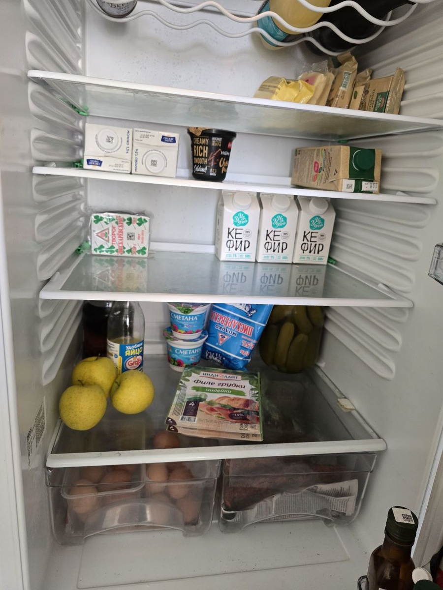 кефир. Осталась резервная баночка протеинового молочного десерта, безлактозное молоко (наш папа пьёт!) и сыр. Сегодня пойдём в магазин покупать 🍅🥒овощи и 🍖мясо. Нужно также докупить молочных продуктов 🍶. Хлеб, крупы, картофель - это всё понятно, тоже будем покупать. Просто это хранится не в холодильнике 🙂 А у вас в конце недели пустой холодильник? Или у вас всегда изобилие?