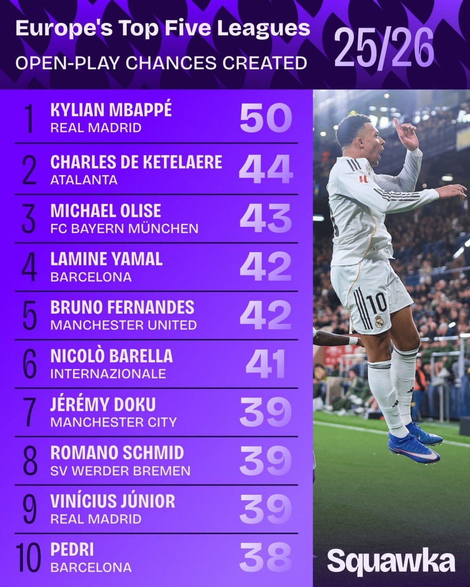 🇫🇷 Мбаппе лидер по количеству ключевых передач в топ-5 чемпионатах в этом сезоне