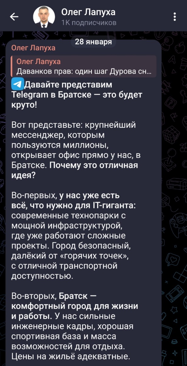 ? Тут два пути: либо начинать работать на благо своего округа, активно привлекая всевозможные инвестиции, либо высказывает пёрл, который начнут все обсуждать. Первый вариант - это долго и сложно, а второй - быстрый. Правда, от второго профита для жителей ноль. Падунский депутат Лапуха выбрал второй и предложил перенести офис Телеграма в Братск. Мечтать, как говориться, не вредно, но у падунчан есть более реальные проблемы, требующие решения.