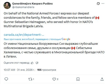 На этот раз мертвым найден канадский солдат недалеко от Риги Себастьян Халмагеан принимал участие в операции Operation Reassurance, сообщили в командовании Канадское военное руководство поспешило добавить, что никакой угрозы для остального контингента нет Никаких подробностей или причины смерти все еще нет Подписаться на канал | 📲 MAX Мы в ВКонтакте