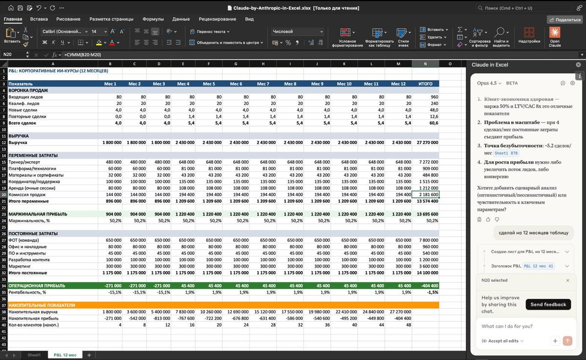 Сегодня вышло расширение Claude для Excel для подписчиков тарифа Pro. Я затестил - и, честно, у меня зрачки расширились от того, как он создаёт таблицы и делает сложные расчёты, создаёт новые листы, выравнивает колонки и так далее. Моя ставка была, что это произойдёт в ближайшие три месяца. А произошло буквально на днях. При установке есть небольшие сложности - но ниже расскажу, как их обойти. Они запартнёрились с Microsoft, поэтому в процессе подключения может потребоваться вход в учётную запись Microsoft (формата “work or school”). Если у вас такой учётки нет, на этом месте многие «застревают» - я тоже сначала не понял, что делать. Полез искать: находил в основном платные варианты, потом натыкался на локальные решения, но с ними есть риск, что они не пройдут проверку. В итоге нашёл простой рабочий путь через создание почты в экосистеме Microsoft. Всё. Вы в матрице 🙂 Теперь в вашем Excel встроен ИИ. Он находится в окошке справа: пишите ему, что хотите сделать - и он сделает. Модель я