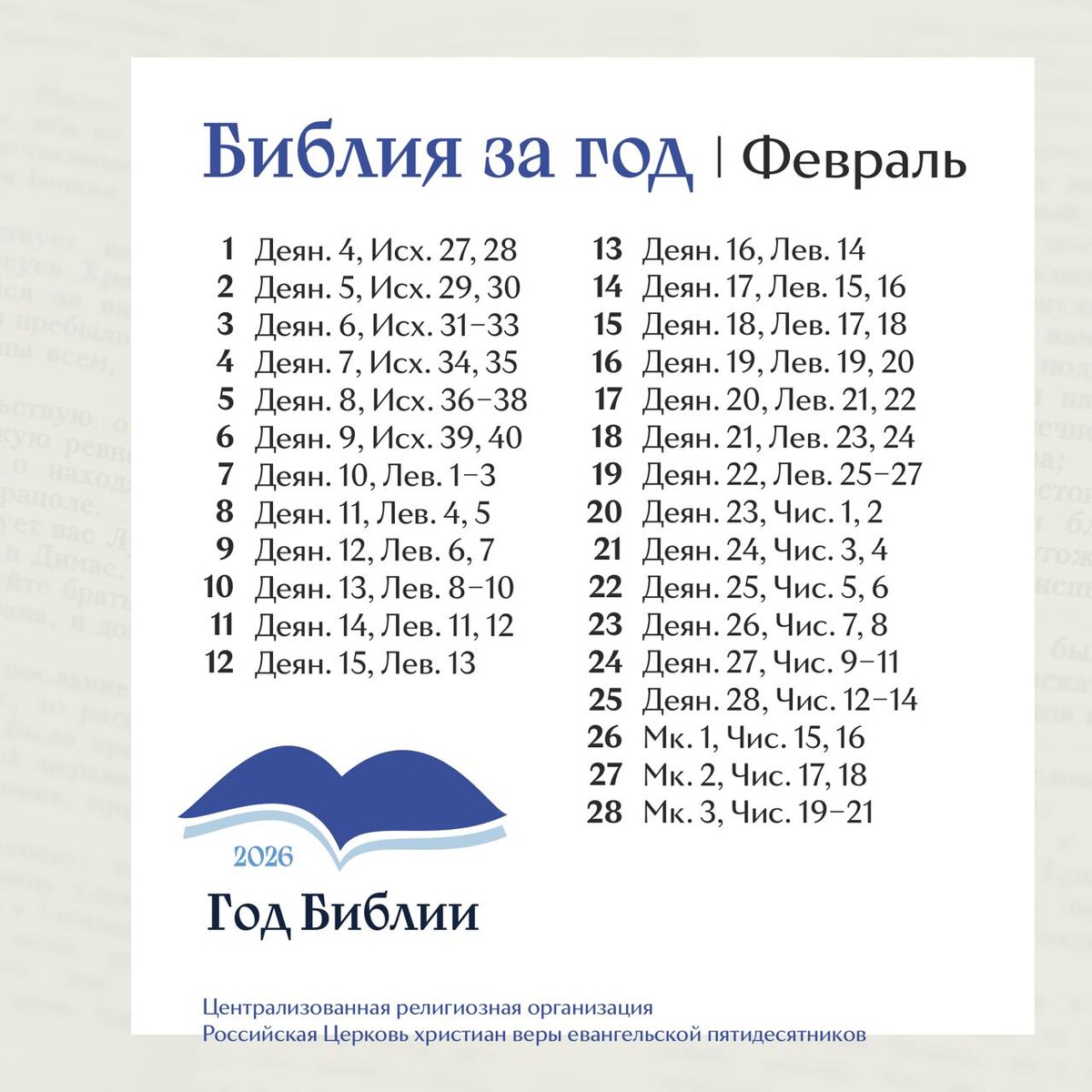 Наше чтение в феврале ведёт нас в истории, где вера становится живой и действенной — там, где люди принимают решения, ошибаются, сомневаются, но продолжают идти с Богом. Мы будем читать о том, как Божий план раскрывается не только в чудесах, но и в повседневных решениях, в верности и в доверии. О том, как Бог ведёт, даже когда путь кажется непростым. Давайте будем читать не «для галочки», а для себя. Чтобы слышать, размышлять, задавать вопросы и находить в Слове поддержку и направление. Читайте в своём темпе. Возвращайтесь, если были паузы. И продолжайте путь вместе с нами. Библия — это живая история, и каждый из нас в ней тоже. На странице Люблю Библию публикуем, какие книги и главы читаем каждый день по нашему плану. Это удобно, подпишитесь. #РЦХВЕ #ЧитаемБиблиюВместе #ГодБиблии #ЛюблюБиблию #БожьеСловоКаждому