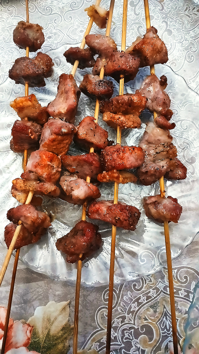 Этот рецепт по своему простой и вкусный. Подойдёт к любому мероприятию. Мне этот рецепт мне подсказал мой Свекор .Он по своему всегда хочет нас накормить ,угостить своими рецептами. В общем мы были в гостях, как обычно мои детки ни чего не хотят кушать. Он то и подсказал как быстро накормить моих мальчишек. Они в сою очередь были этому рады. Не буду вас долго задерживать вот и рецепт. Мясо должна быть обязательно свежим в этом рецепте использовали шею от свинины. Чистый брусок мяса нарезаем кубиками одинакового размера. Деревянные шпажки на 10-15 минут можно окунуть в воду. Мясо солим, немного перчим добавляйте свои любимые приправы. Перемешиваем мясо и оставляем мариноваться на 20 минут. Чтобы готовое мясо было сочным и ароматным, сначала его нужно замариновать обязательно .Нанизываем мясные кубики на шпажки, укладываем на борта огнеупорной формы и ставим в раскаленную до максимума печь. Готовим шашлык из свинины на шпажках в духовке при температуре 180 градусов примерно 25-35. Па