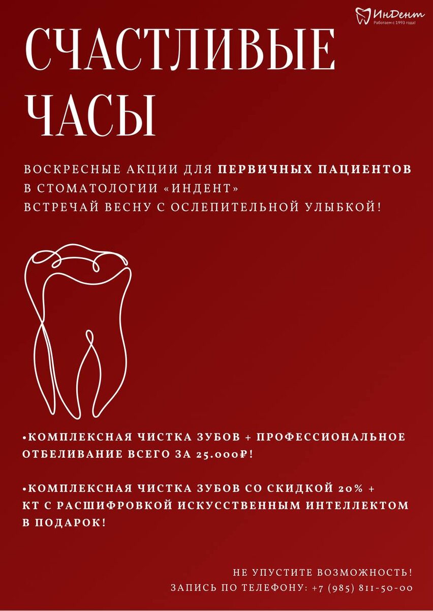 » ♥️ Мы подготовили для вас выгодные предложения, чтобы вы встретили весну с уверенностью! 🎁 Комплексная чистка зубов + отбеливание всего за 25.000₽! 🎁 Первичная комплексная чистка зубов со скидкой 20% только в воскресенье + КТ с расшифровкой искусственным интеллектом в подарок! Не упустите возможность! Запись по телефону: ✈️ +7 (985) 811-50-00