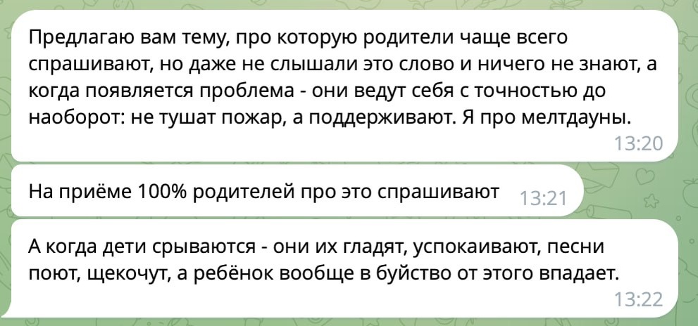 ❤️ Хочу начать с простой, но важной мысли: вредно не называть вещи своими именами. Особенно когда речь идёт о нейроотличиях. Последние дни я глубоко разбиралась в теме мелтдаунов и шатдаунов. И вот что меня по-настоящему поразило: если вбить в вк поиск «мелтдаун» – вы найдёте одно (!) видео по теме. Если «шатдаун» – ноль. Кто-то скажет: «Алён, ну так давай по-русски пиши – информации будет море». А я такая: «так по-русски это называют неправильно и отсюда куча проблем». У нас почти всё, что связано с перегрузкой ребёнка, называют словом «истерика». И этим словом мы автоматически: 🤨 приписываем намерение («он это специально»), 😒 перекладываем ответственность на ребёнка («давай успокаивайся и дальше пойдем»), 🤫 начинаем «воспитывать» там, где жизненно нужна помощь («ну что ты валяешься? Мы тебя привели в парк, другие дети играют спокойно, а ты орешь»). А теперь важное. 🔹 Мелтдаун ≠ истерика. Мелтдаун – это острая перегрузка нервной системы с внешней разрядкой. Крик, плач, агресс