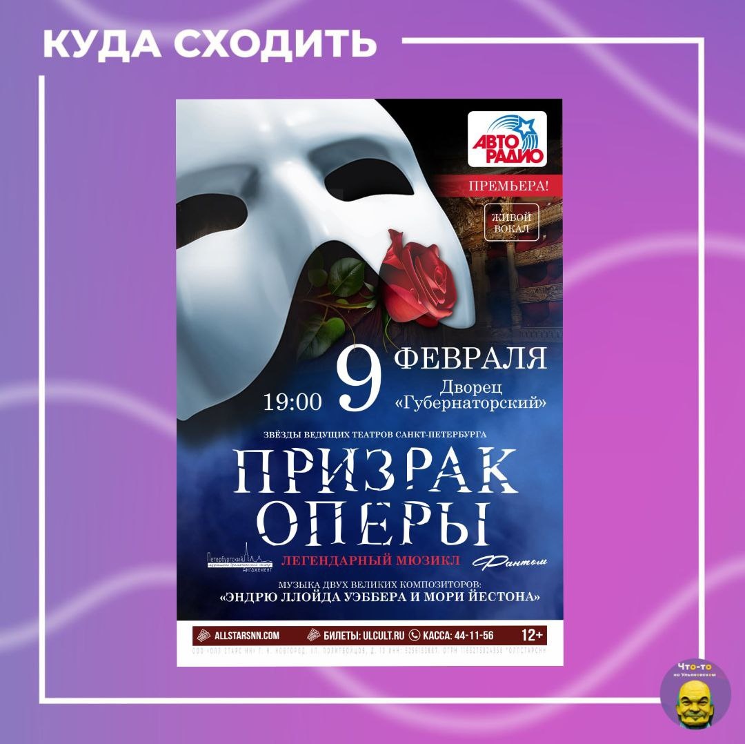 Призрак Оперы»🎭 Основа сюжета — мелодраматические отношения начинающей певицы Кристин и влюблённых в неё покровителя «Оперы» графа де Шандо и её учителя музыки Эрика, имеющего причины скрывать лицо под маской. Вас ждут великолепные голоса, невероятная сценография, которые перенесут вас в атмосферу знаменитого Парижского оперного театра! 📅Когда: 9 февраля в 19:00 📍Где: ДК "Губернаторский" (ул. Дворцовая 2/13) #куда_пойти_ул