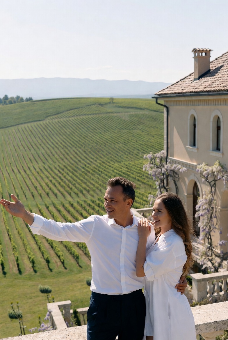 Мы стояли на просторной, залитой светом террасе большого загородного дома. Здание было светлым, почти воздушным – белые стены из местного ракушечника, широкие арочные окна, увитые уже тронувшейся в рост глицинией. Её сиреневые кисти, пока ещё в бутонах, обещали через пару недель превратить фасад в душистое цветочное облако. Мы приехали сюда всего несколько минут назад, и Воронцов, не дав мне даже снять лёгкое демисезонное пальто, схватил за руку и тут же потащил за собой по прохладным каменным ступеням наверх – чтобы первым делом продемонстрировать окрестности с высоты.