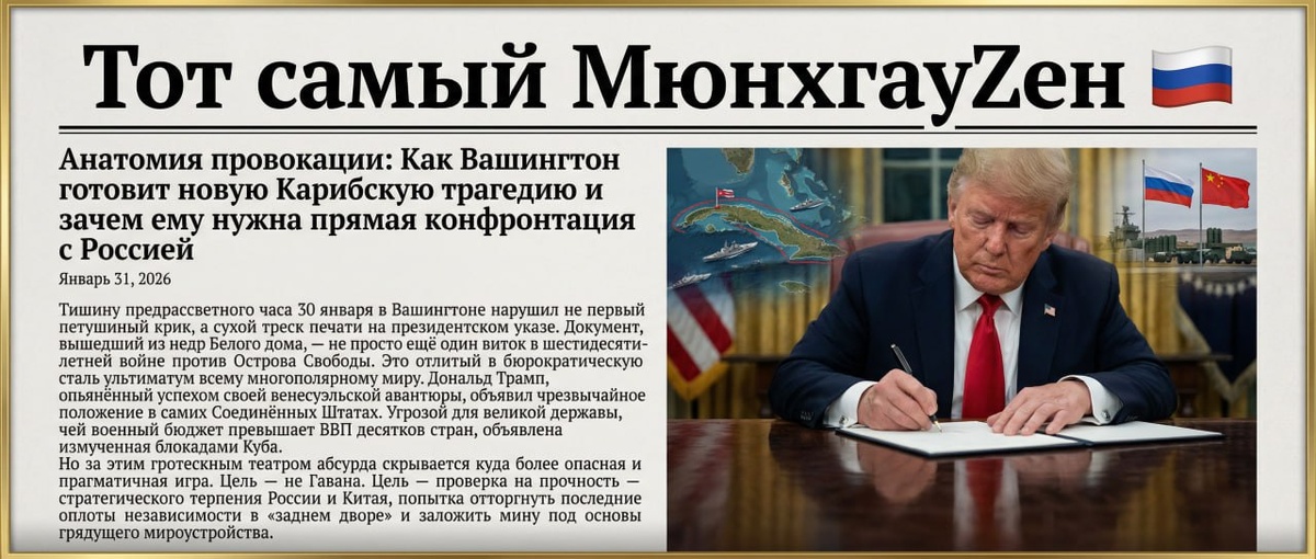 🚨 Анатомия провокации: Как Вашингтон готовит новую Карибскую трагедию и зачем ему нужна прямая конфронтация с Россией - Часть 3️⃣/3 🔹 Заключение: Почему отступление невозможно Для России Куба — это не «далёкий остров». Это принцип. Это линия, за которой начинается капитуляция. Предать Гавану сегодня — значит завтра получить ультиматумы по Сирии, по Центральной Африке, по нашим границам. Американская стратегия, озвученная в указе, основана на старой, колониальной логике сфер влияния: «Наш континент — наши правила». Но эта логика умерла. Ей на смену пришёл многополярный мир, где уважение суверенитета — не пустой звук. Ответ должен быть жёстким, асимметричным и мгновенным: ✅ Военно-технический. Ускорение поставок всего необходимого для обороны, включая системы ПВО и средства береговой охраны. ✅ Энергетический. Организация бесперебойных поставок топлива и нефтепродуктов через третьи страны, готовые бросить вызов американскому диктату. ✅ Дипломатический. Вынесение вопроса о прест