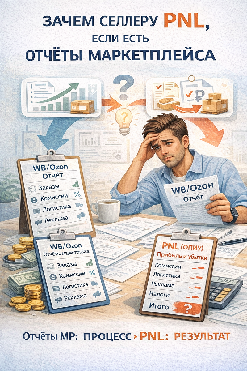 Один из самых частых вопросов, которые я слышу от селлеров: «А зачем мне PNL, если у меня есть отчёты WB / Ozon? Там же всё видно». На первый взгляд — логично. Отчёты есть, цифры есть, выгрузки есть. Но проблема в том, что эти отчёты не отвечают на главный вопрос бизнеса. Отчёты маркетплейсов показывают: Это хорошие операционные данные. Но они разрозненные. Каждый отчёт отвечает на свой маленький вопрос, но не показывает общую картину. Попробуй прямо сейчас ответить честно: 👉 Сколько я заработал за прошлый месяц? Не оборот. Не «примерно». Не «по ощущениям». А чистую прибыль после всех расходов и налогов. Большинство селлеров в этот момент зависают. Отчёты маркетплейса — это детали. PNL (ОПиУ) — это итог. PNL собирает всё в одну таблицу: И показывает результат: PNL отвечает не на вопрос «что произошло», а на вопрос «что это значит для моего бизнеса». Типичная ситуация: По отчётам всё выглядит неплохо. А по факту: Потому что: PNL как раз и показывает, где бизнес теряет деньги. PNL — эт