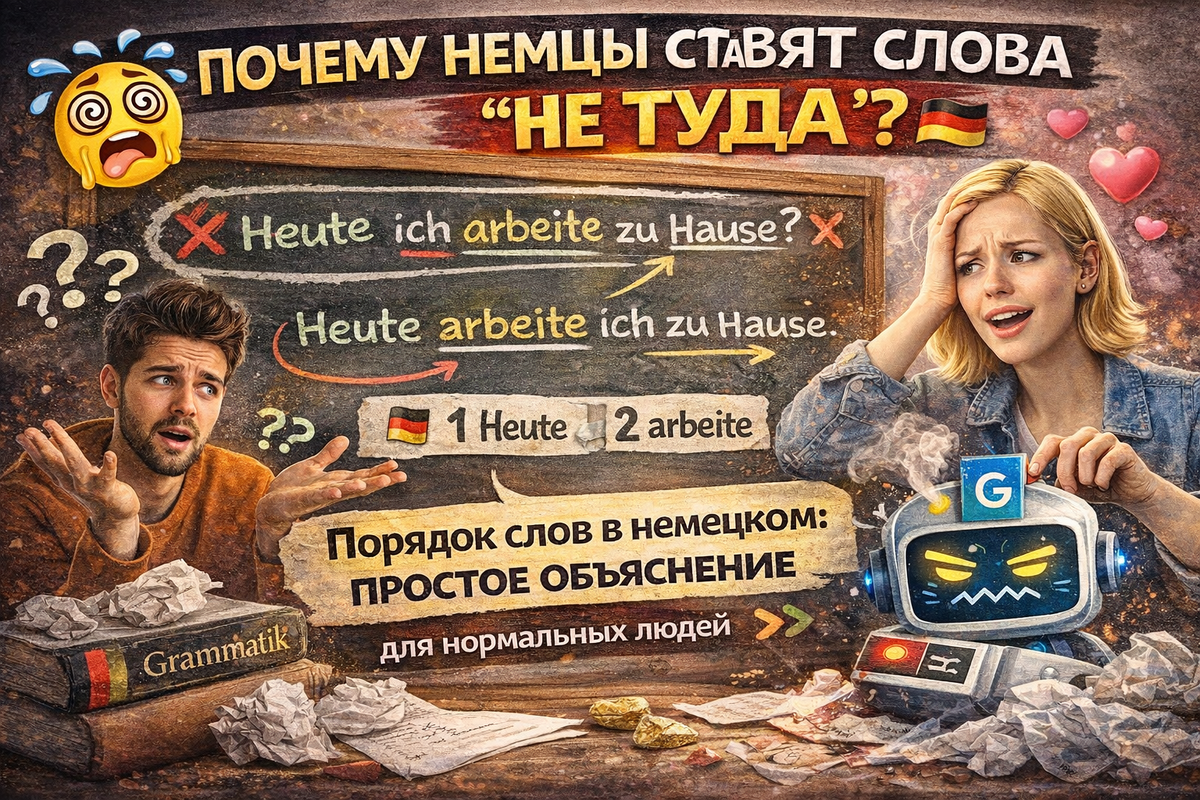 ➡️ кроме глагола на втором месте. Русские говорят так: ❌ Heute ich arbeite zu Hause Для немца это звучит как 🤖