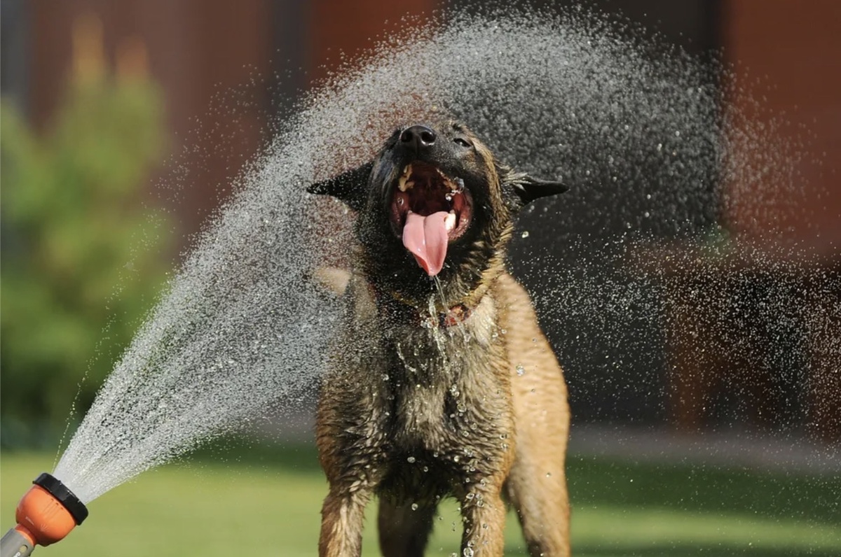 - Обрызгивание. Опрыскивайте собаку прохладной водой, особенно в области живота и между задними лапами.