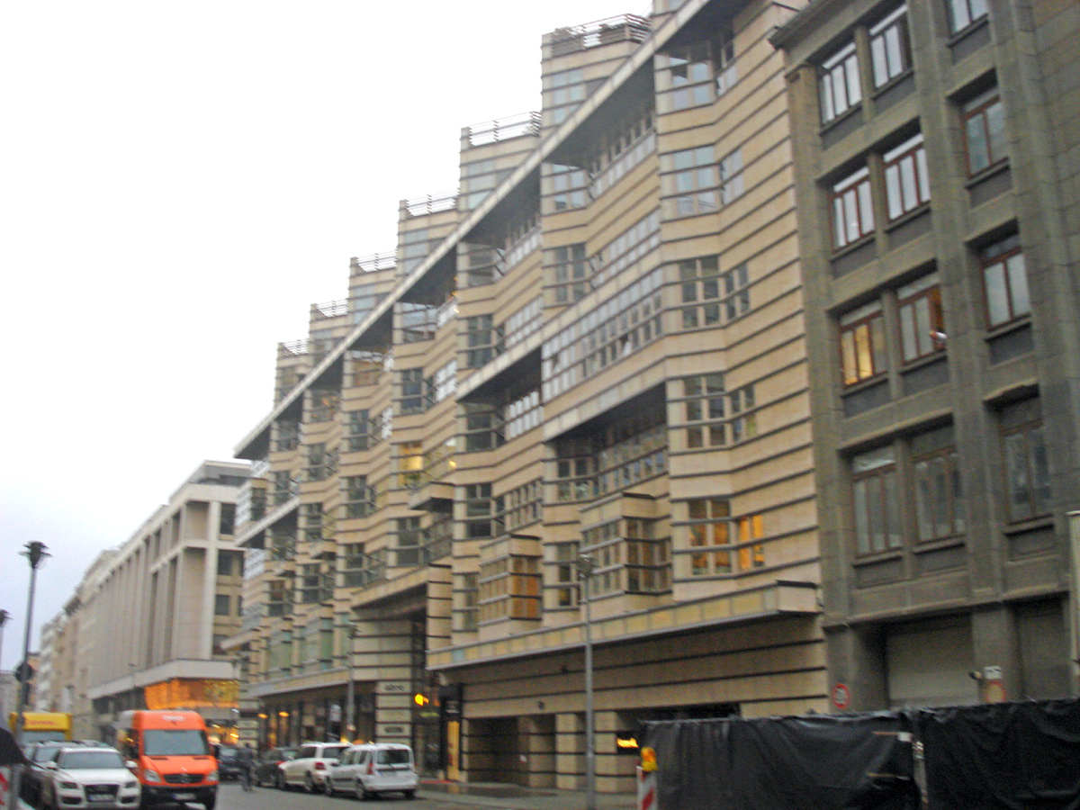 Не могу сказать, что мне очень хотелось увидеть место перехода из восточного Берлина в западный, но мужу почему-то это было важно. Мы вернулись на Фридрихштрассе и поняли, что не знаем в какую сторону идти теперь. Все еще шел дождь, изрядно похолодало, зима все-таки, настроение под стать погоде. Была мысль отказаться от поисков этого контрольно-пропускного пункта, наш добровольный гид уже опрашивал прохожих и выяснил-таки как добраться до КПП "Checkpoint Charlie". Некрасиво было бы не оценить его стараний и мы без особого энтузиазма побрели в указанном направлении, по пути запечатлев несколько зданий, из которых наиболее эффектно выглядело, помещенное ниже