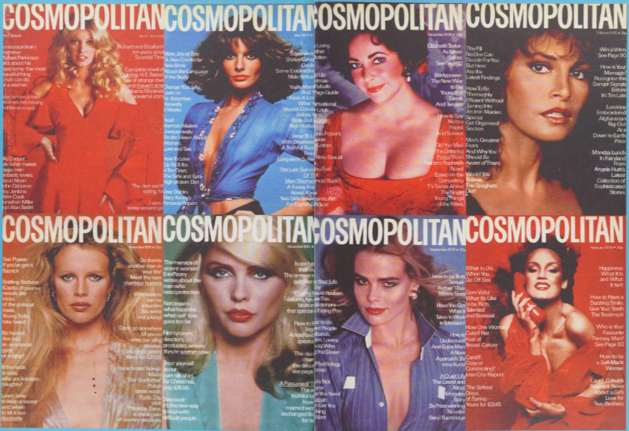 Успешный журнал Cosmopolitan был запущен в марте 1972 года. Первый номер был распродан тиражом 350 000 экземпляров уже к обеду. Посмотрите на обложки 70-х годов. Все они хорошо иллюстрируют западные каноны красоты той эпохи и визуальный язык глянца.
