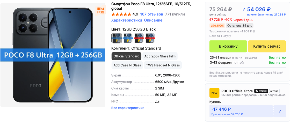 С покупкой сложно промахнуться — POCO выпускает исключительно глобальные версии. Ростест тоже встречается, но на маркетплейсах он редкий зверь и обычно заметно дороже. Переплачивать ли за официальную гарантию — вопрос философский, каждый решает сам.