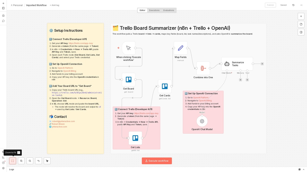⚡ Что делает: Автоматизация запускается вручную и извлекает задачи из доски Trello. Затем она обрабатывает данные с помощью GPT-5-Nano для создания краткого резюме, добавляет заметки с информацией и отправляет результаты обратно в Trello, упрощая управление проектами. 👥 Кому подойдёт: Идеально для команд, которые активно используют Trello и хотят улучшить обзор задач. 💡 Пример: Каждый раз, когда проект запускается, резюме задач автоматически обновляется в Trello для всех участников. 🔗 Ноды: manualTrigger, lmChatOpenAi, stickyNote, trello, set, aggregate 📊 Сложность: Средний #n8n #automation #nocode #aiagent #ai #aggregate ════════════════ 🎬 YouTube | ⚙️ Канал | 💬 Чат | 📮 Реклама