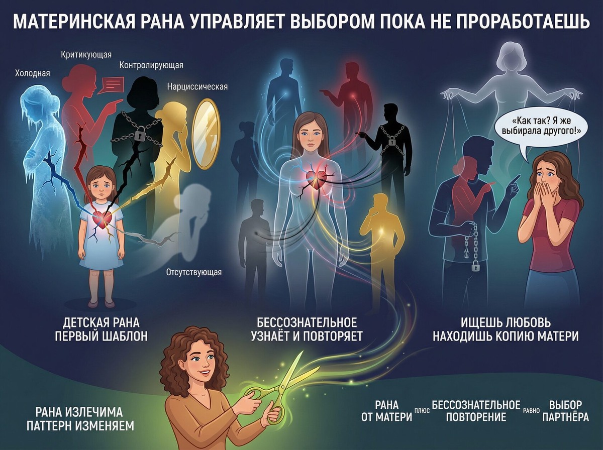 Это не совпадение. Это повторение. Материнская рана управляет выбором партнёра, пока не проработаете её.