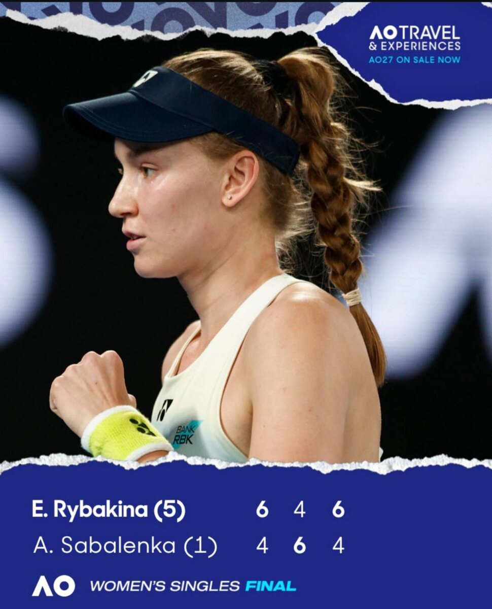 ! В финальном матче пятая ракетка мира одержала победу над белоруской Ариной Соболенко. Встреча завершилась со счётом 6:4, 4:6, 6:4. Продолжительность игры составила 2 часа 18 минут. 🏆 Таким образом, Рыбакина выиграла свой второй турнир Большого шлема. В 2022 году она победила на Уимблдоне. @russian_rt_sport